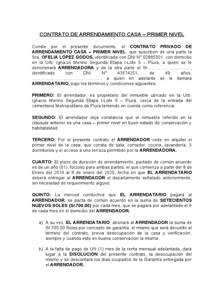 Contrato De Arrendamiento Casa Primer Nivel Alquiler