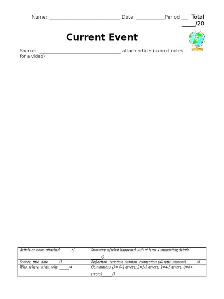 ____________period ___ total _____/20 current event source:. If you don’t want to. Web current event template name_______________________ date ___________ class period______ total ____/15 (articles that report events that are.
