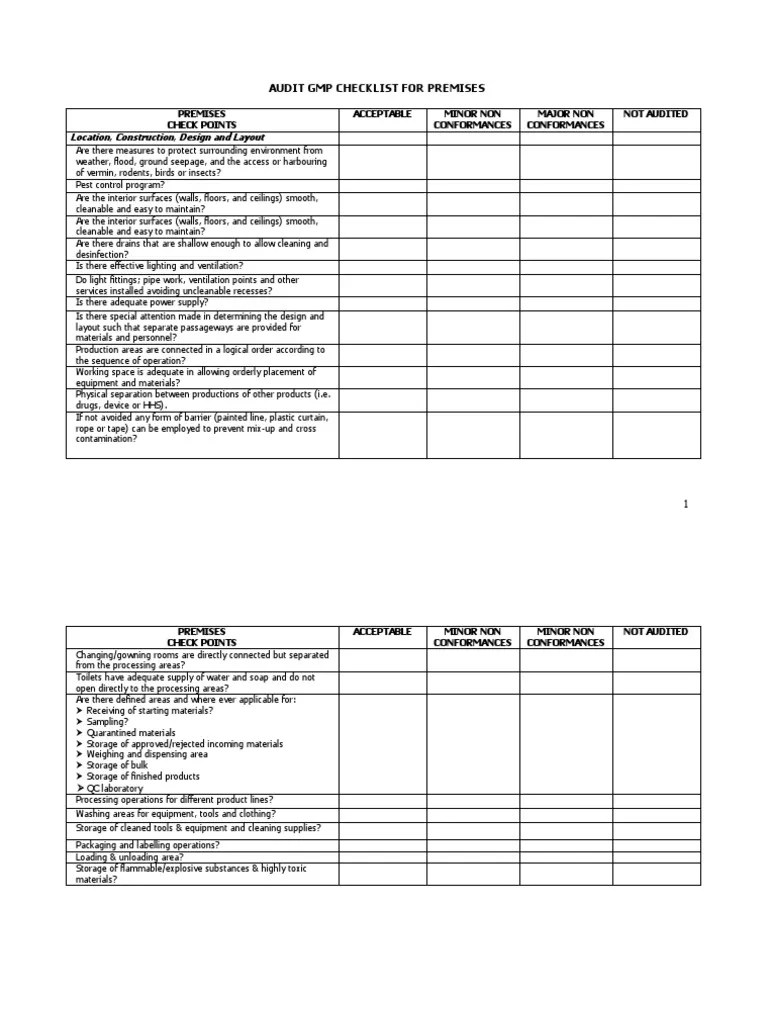 Audit Gmp Checklist For Premises Location, Construction, Design and