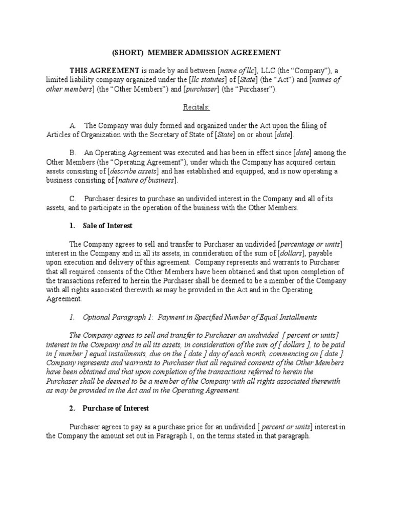 Short Form LLC Member Admission Agreement Limited Liability Company
