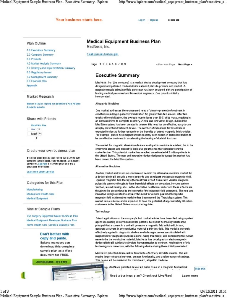 Sample Medical Equipment Business Plan Medical Device Business Plan