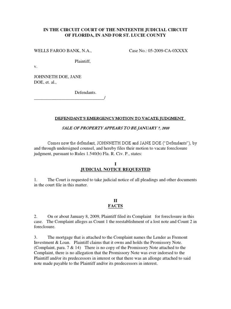 Florida Motion Set Aside Judgment Summary Judgment Foreclosure