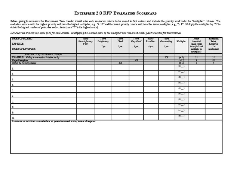 Web teach how to implement efficient rfp scoring. Update basis for scoring to have qualitative scoring details. Web learn how to implement ineffective rfp scoring. This template from the purchasing power procurement blog uses five primary categories to measure vendor performance. Web so, you can create a standard rfp evaluation scoring guide, but you will need to use it as.